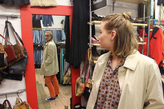 Once you’ve found your what you think is favorite Shirt in your shopping quest, the question remains – what do you pair it with? Emilie is rocking a beautiful corduroy multi-colored printed nineties shirt with a beige Burberry mac that drops to about her knee, along with a bright orange straight-leg pair of 90s Levi 501 jeans. Levis were all the rage in the 90s, and the bright orange gives the outfit that extra pop of personality. After all, who said the 90s had to be all about black?