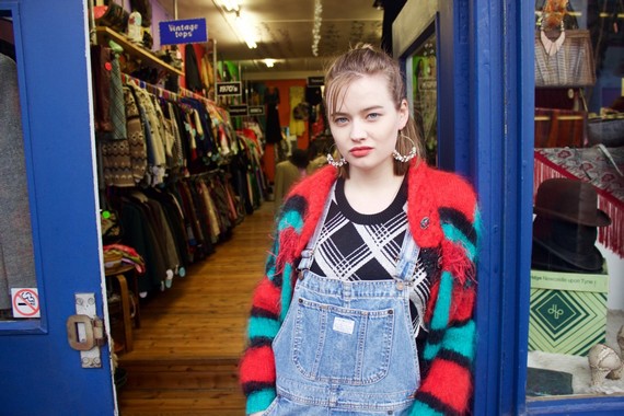 One way to help inspire your unique dungaree look is to step outside the box. Why not match your 90s dungarees with a 70s tank top like Emilie is wearing? Playing around with different styles and decade pieces will bring a unique twist to your look – and help you stand out from the crowd. Emilie likes to match her vintage dungarees with a long, knitted 90s vintage mohair cardigan and 90s black leather tasseled loafers. The bright cardigan and dark retro mens shoes give her dungarees a more masculine, edgy twist.