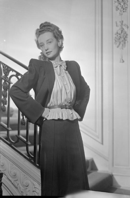 Model wears a navy blue spring suit by fashion designer Madame Champcommunal of Worth.