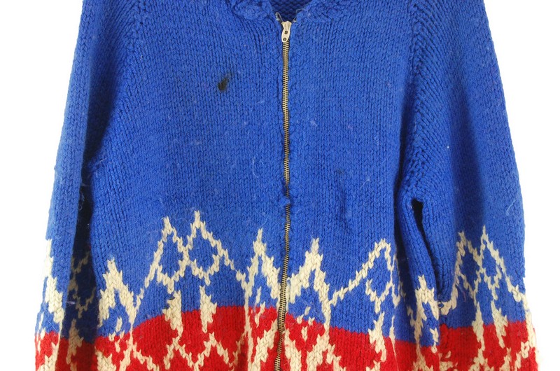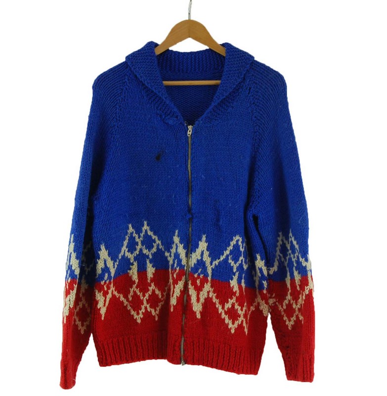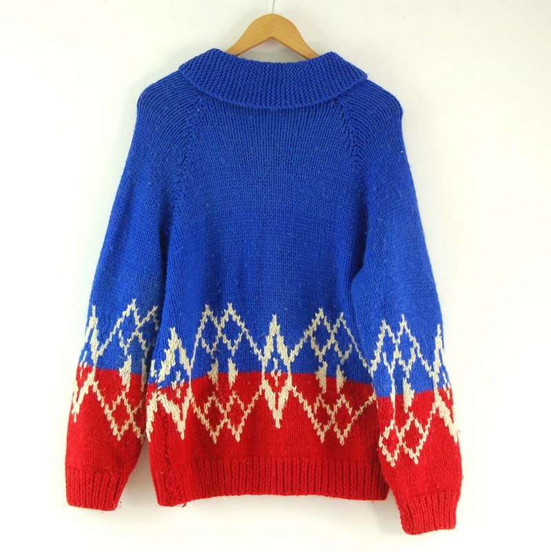 Features a thick 2ply royal blue wool body, with a red bottom panel and white diamond pattern across front, back and sleeves.