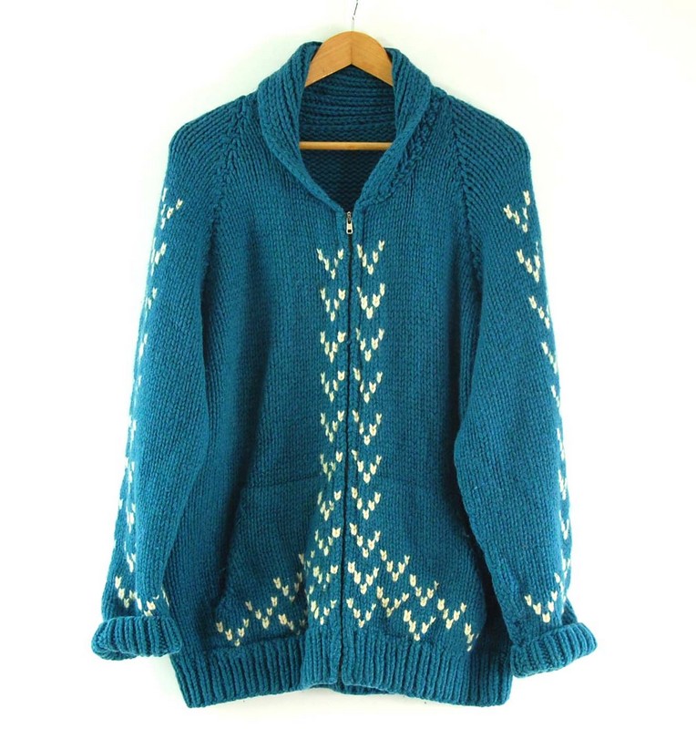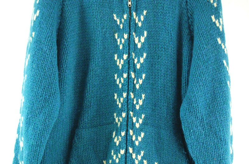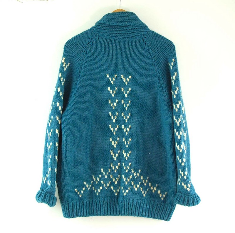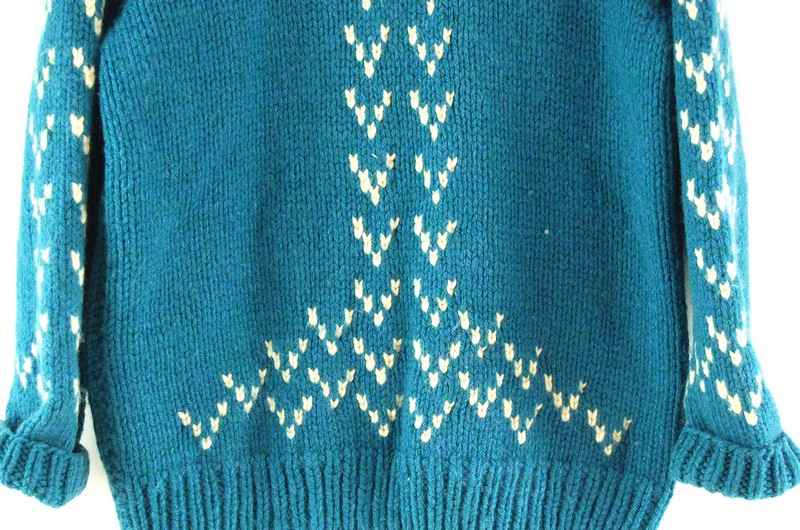 Features a thick 2 ply wool in blue with white ‘v’ pattern at centre front, centre back, bottom edge and down the sleeves.