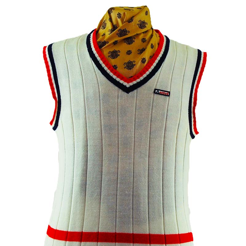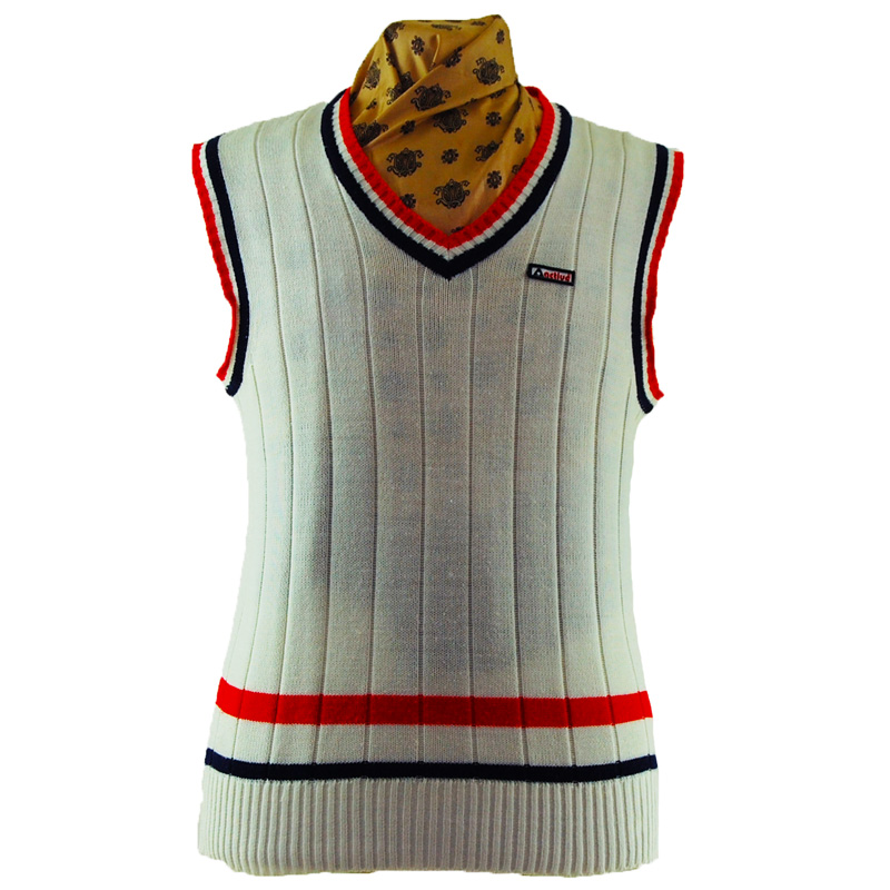 Features a white largely ribbed body with blue, white and red stripes lining the collar