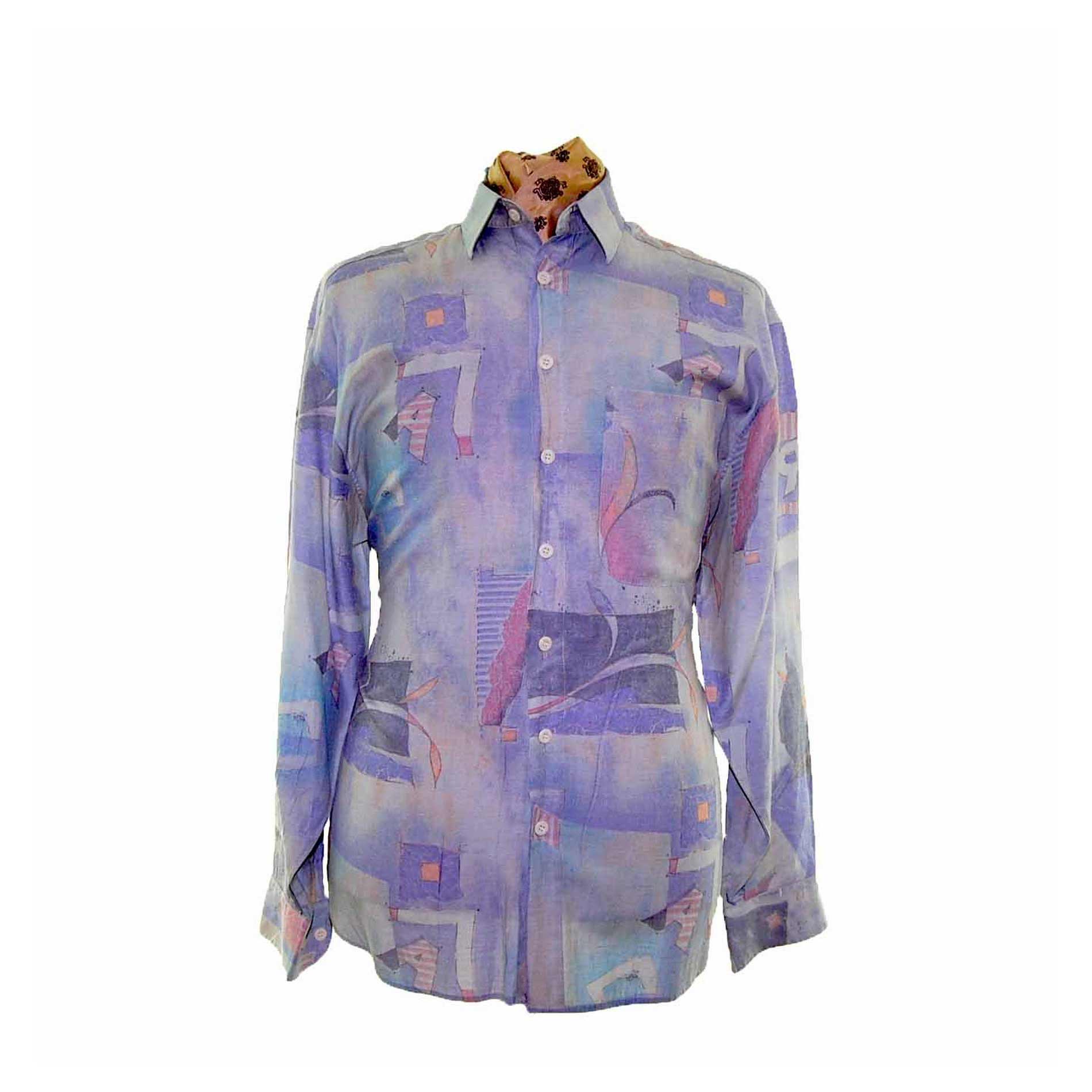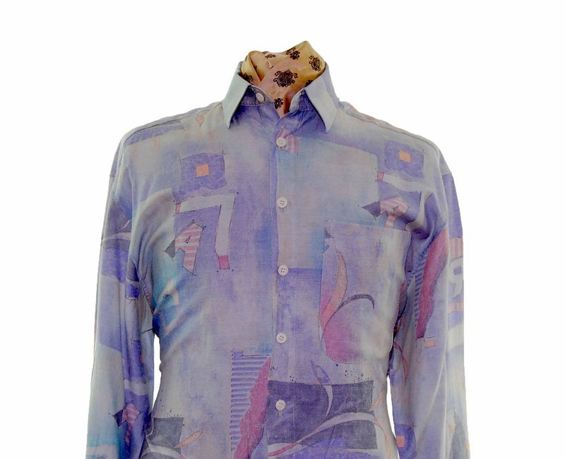The Shirt features a design with squares and letters in the colors of purple, mint green red and yellow.