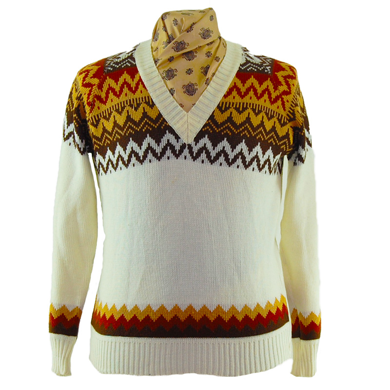 Patterned Icelandic Wool Sweater. Features thick cream knit body with a zigzag and circle pattern coming away from the neckline consisting of different shades of grey, detailing on the cuffs and waistband with a darker grey in a zigzag pattern inside the lighter grey. With a thick knitted, ribbed crew neck, long sleeves, ribbed waistband and cuffs .
