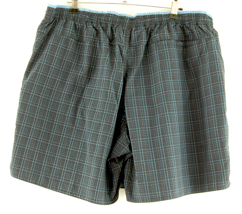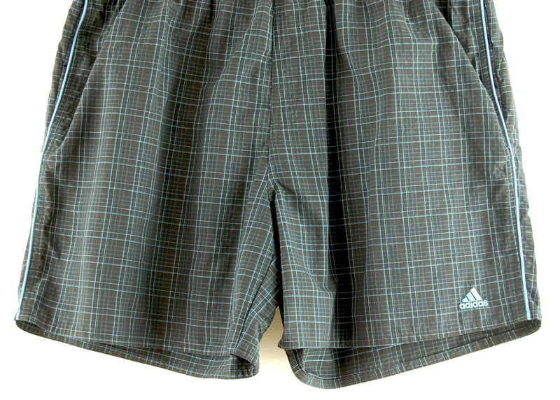 Features blue and grey checked fabric, with Adidas lettering and logo at bottom right leg, light blue piping at sides and elasticated drawstring waistband.