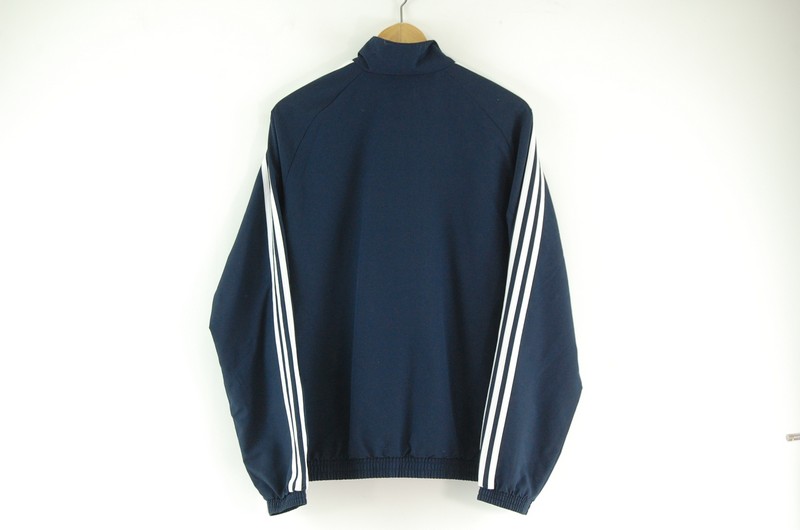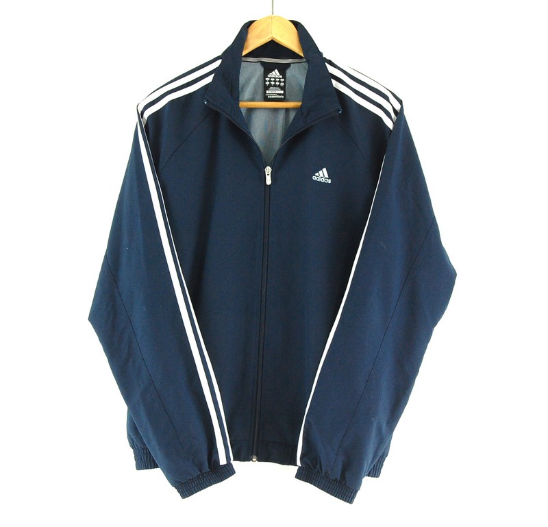 Features a navy blue body with three white stripes on the shoulders and sleeves. Adidas lettering and trefoil logo at the chest and two side pockets. Long sleeves, front zipper closure and is fully lined.