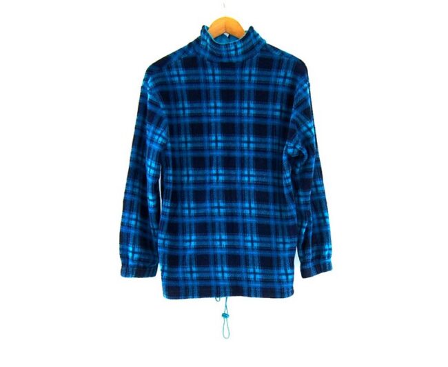 Features a checkered print in dark and light blue. Has long sleeves, front full zip, two vertical front pockets, elastic drawstring waistband and elasticated cuffs.