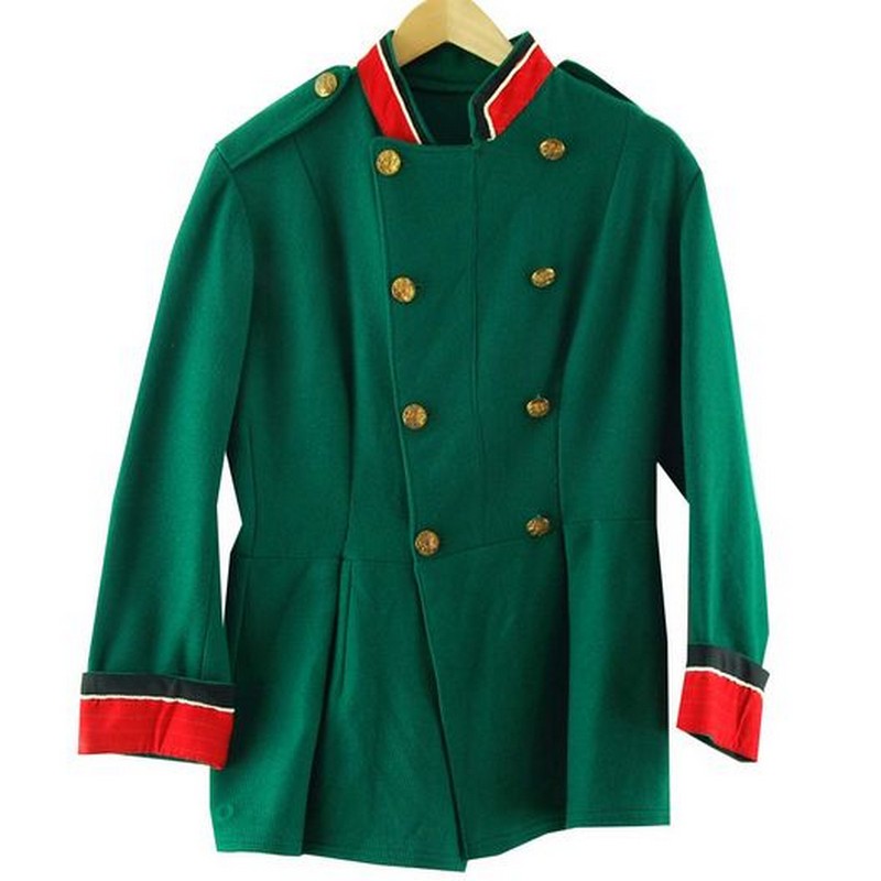 Features a green body with ten Firmin & Sons brass buttons, eight throughout the front and two on each shoulder.