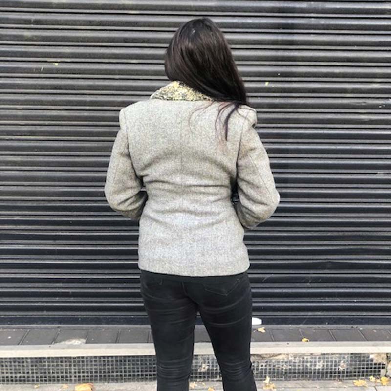 Features a thick grey wool body, with a real grey astrakhan fur collar and exposed lapels, two slash pockets on the hips.