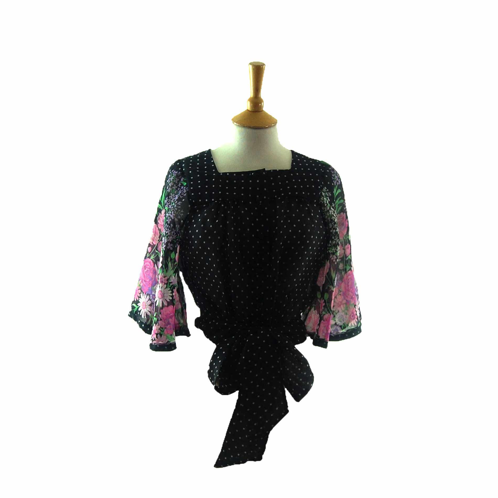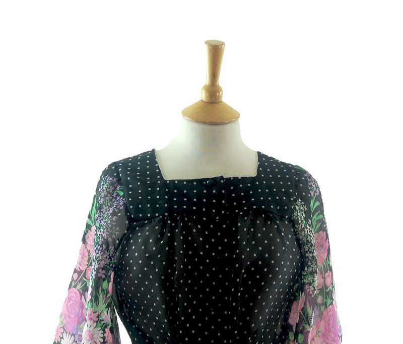 Features contrasting patterns of polka dots and florals