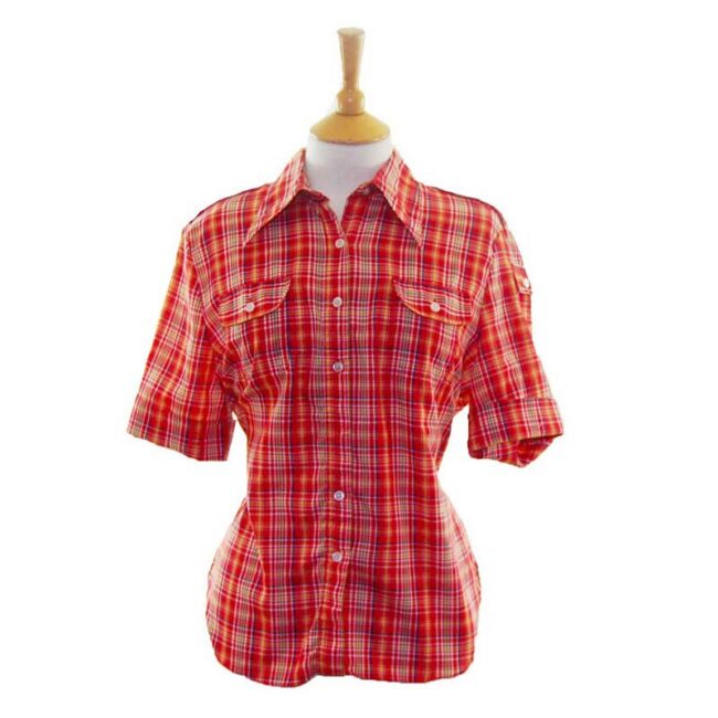Features a bright red fabric body with green, yellow, white and blue checkers