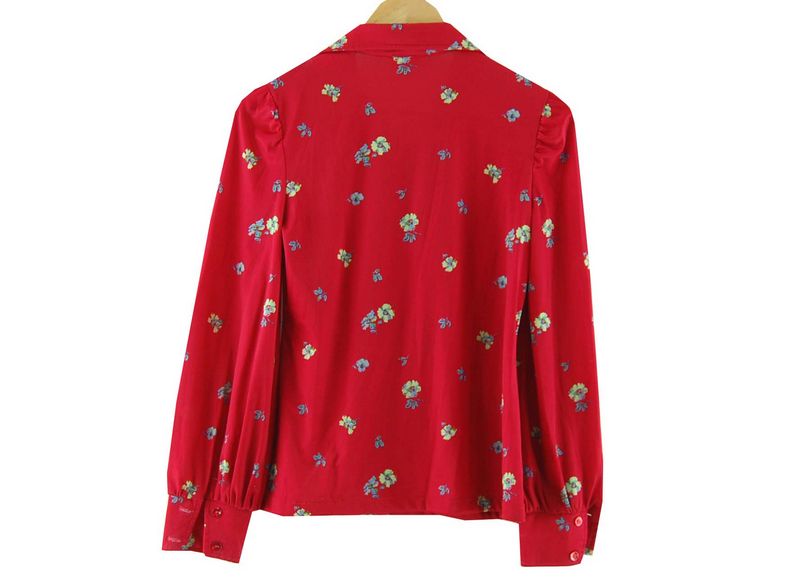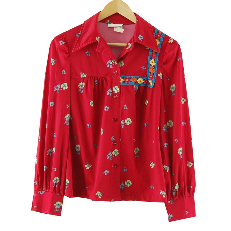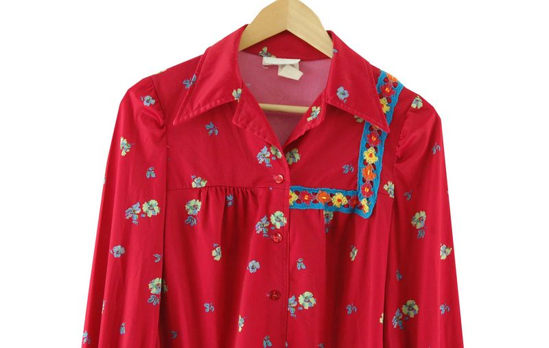 Features a red body with a multicoloured floral pattern which consists of green, blue and red, a notched collar.