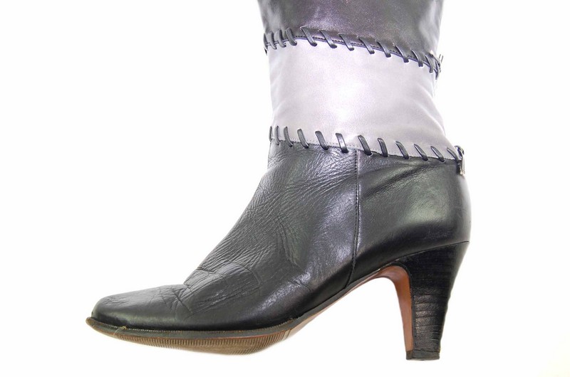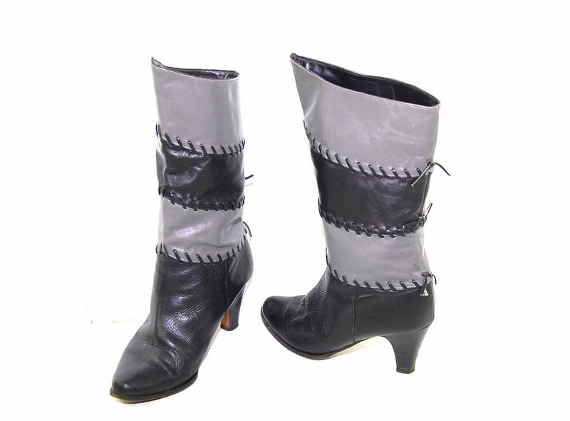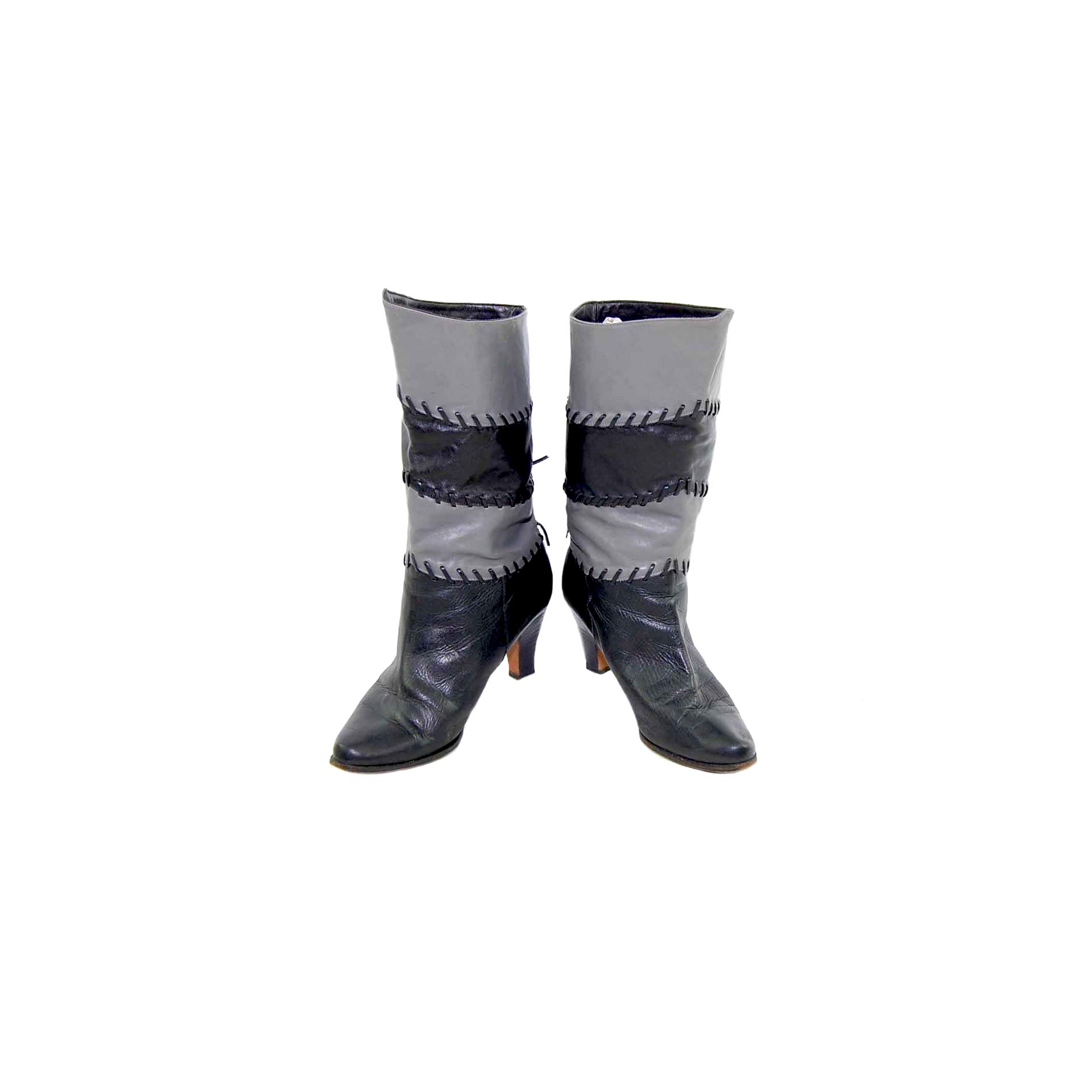 Features black leather with panels of grey leather stitched together with leather string.