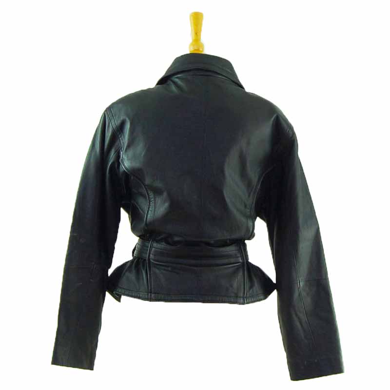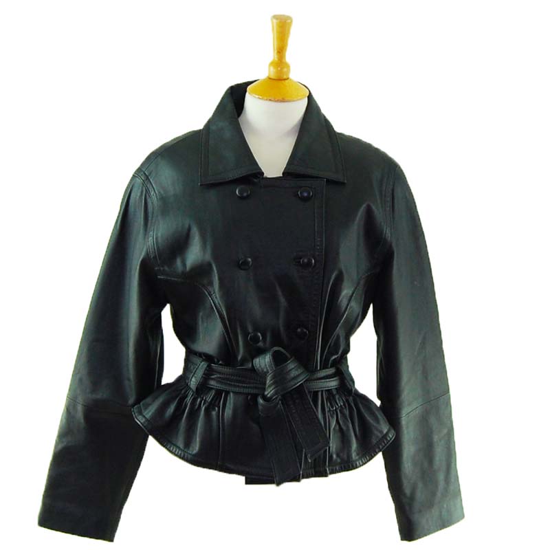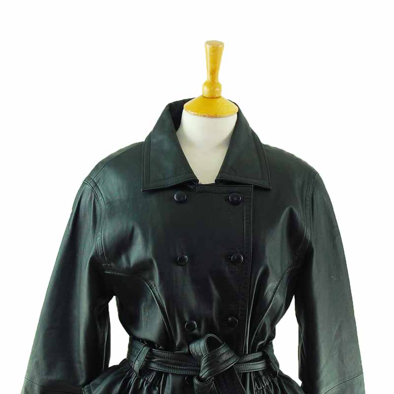 Features real black leather fabric with large lapels and wide collar. It is also double breasted.