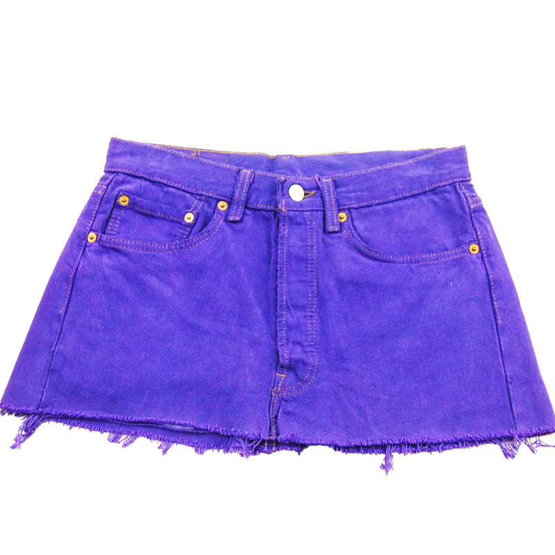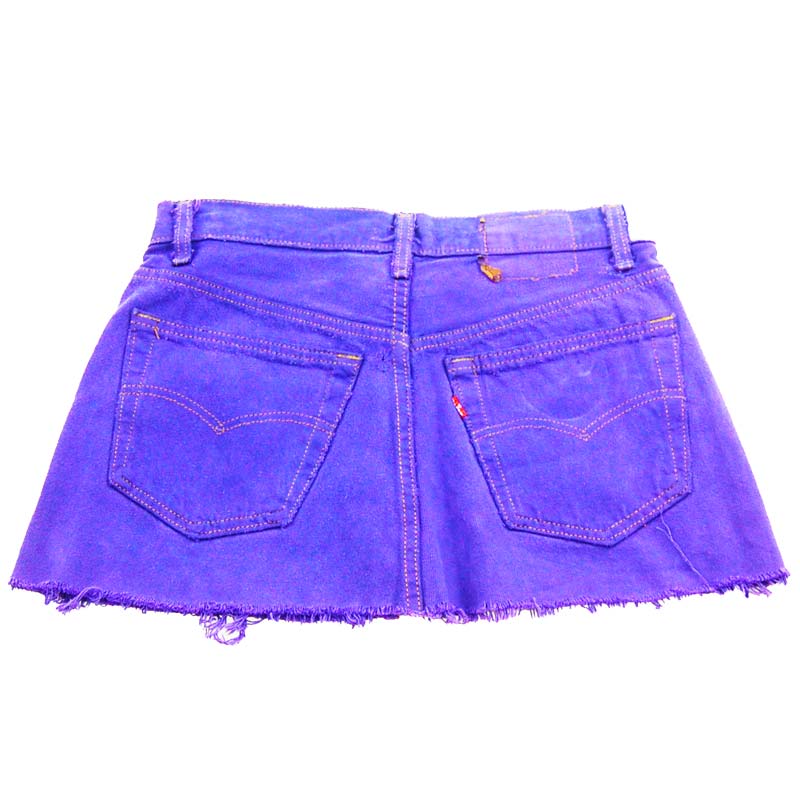 90s Frayed Levis Mini Skirt. Features a dark purple dyed denim with a raw hem and frayed edges, it also has two patch pockets on the back with the classic levis red tab on the right pocket, as well as belt loops, and button up fastening.