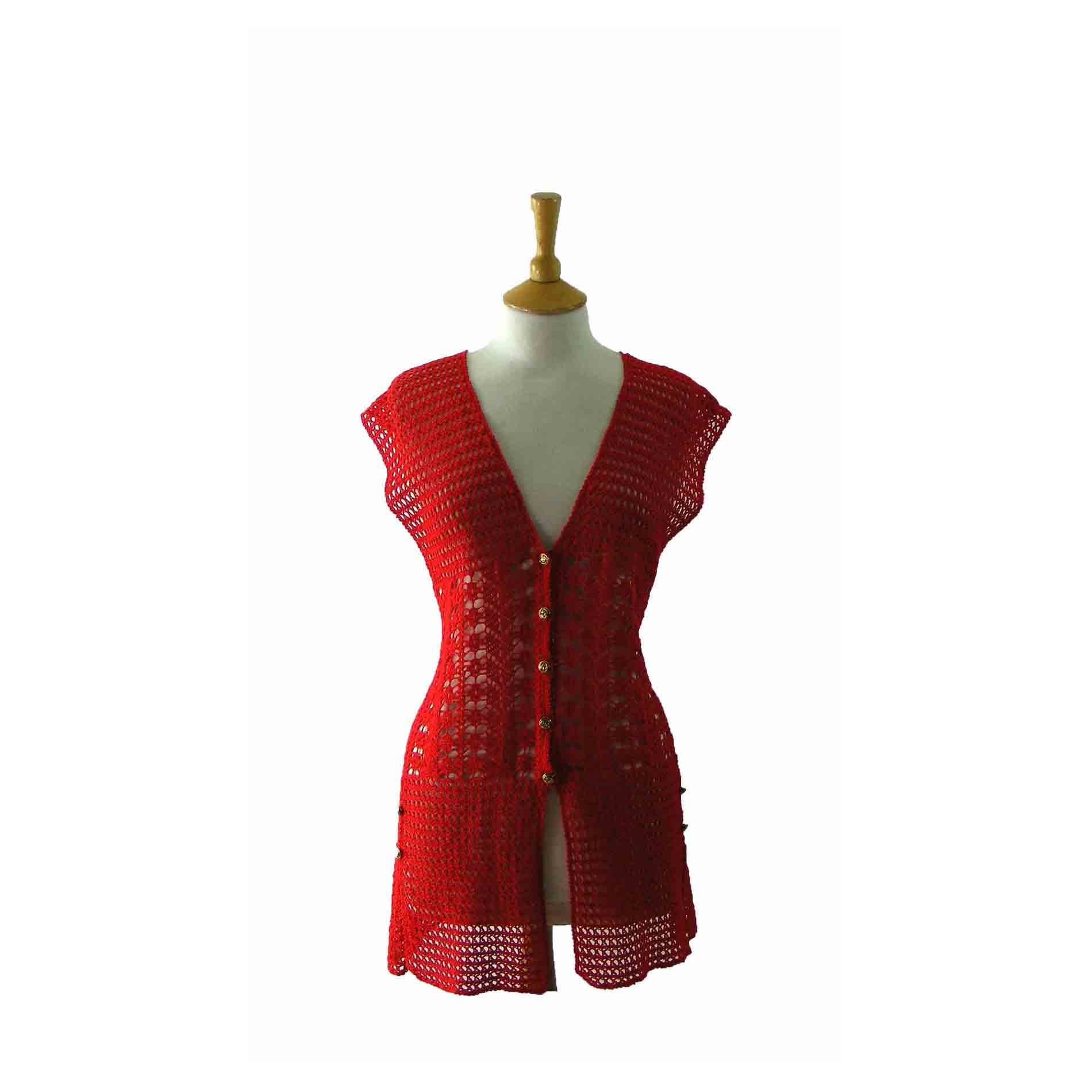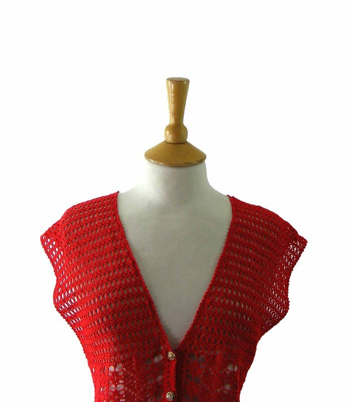 Features a bright red crocheted body