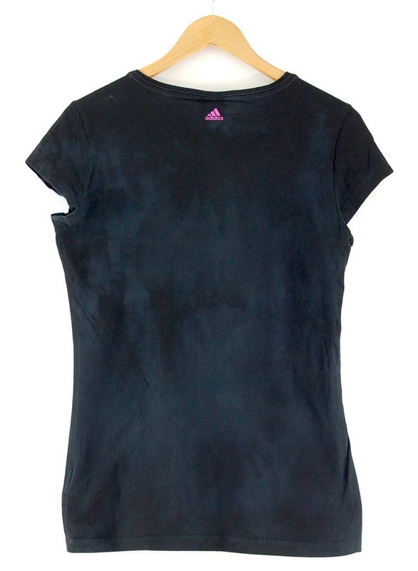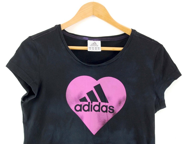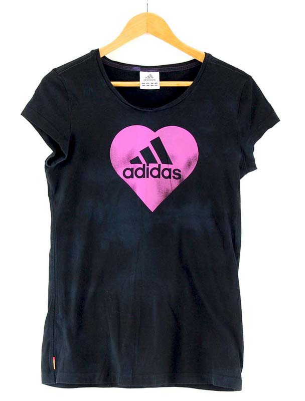 Features a black body with pink heart and Adidas logo at centre front, with a ribbed crew neck and short sleeves.