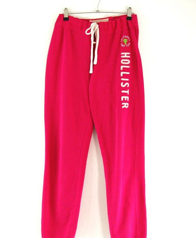 Features pink fabric with ‘California surf Team’ and ‘Hollister’ lettering with trophy symbol at right leg in white and green.