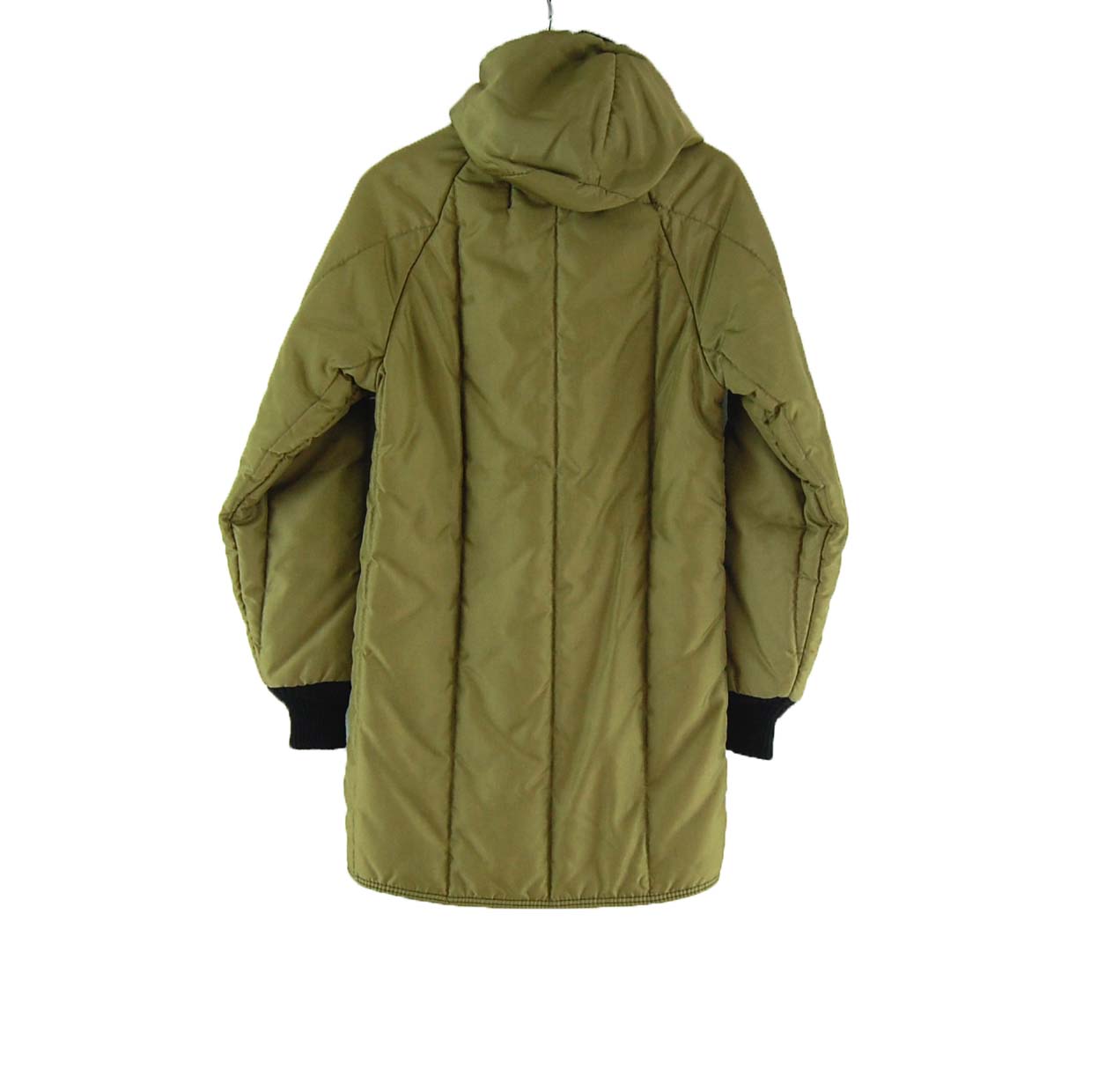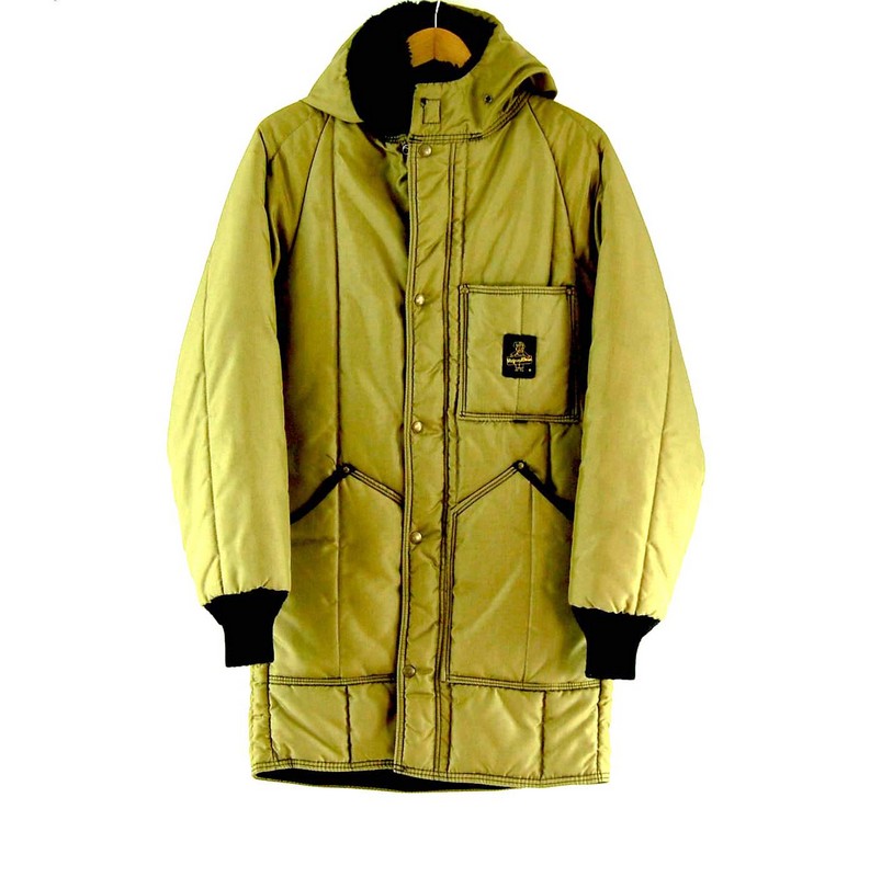Features kharki green fabric with three front pockets, Refrigiwear dog logo at right chest and hood with black faux lining.