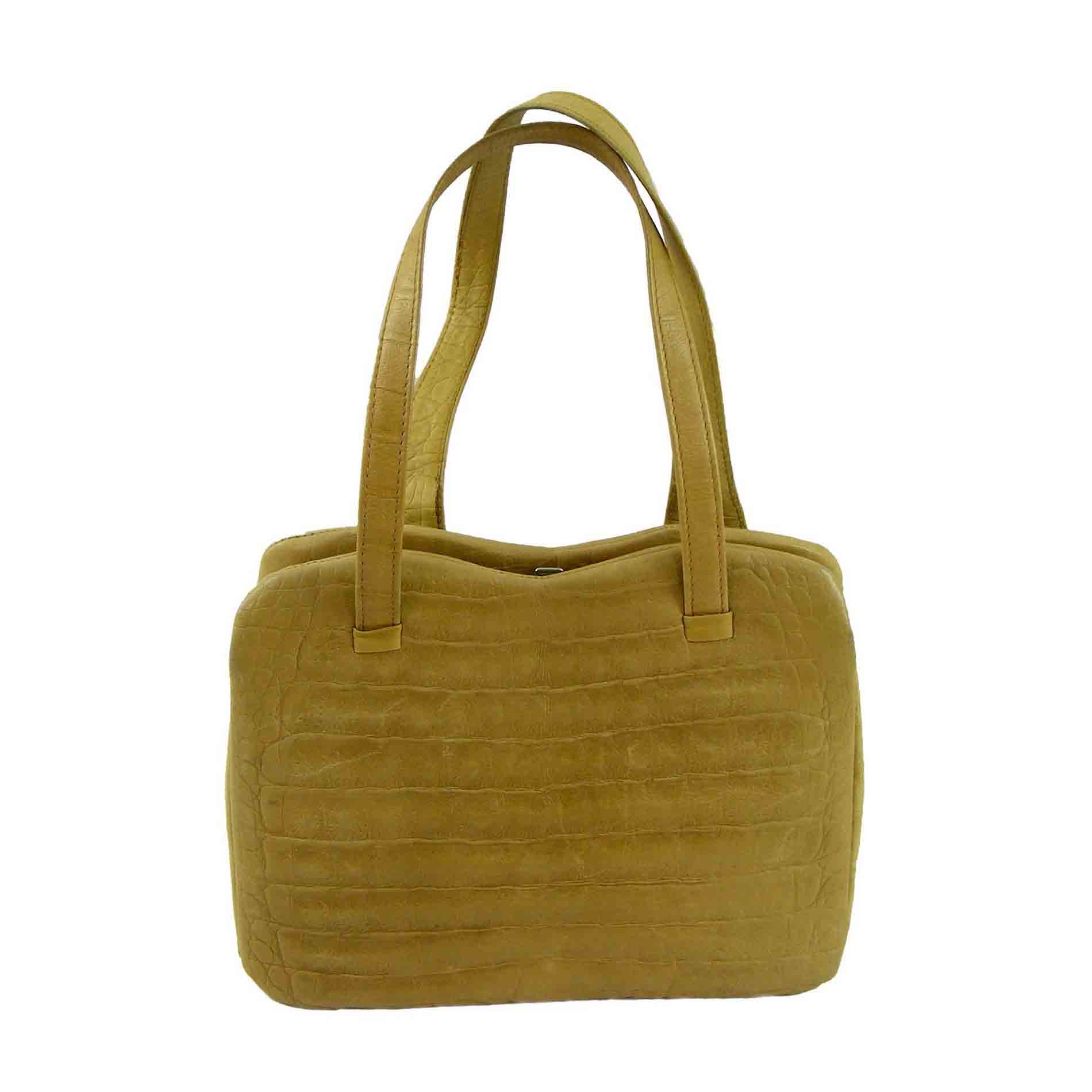 Features sand yellow crocodile skin design, horseshoe handles and a bow shaped frame
